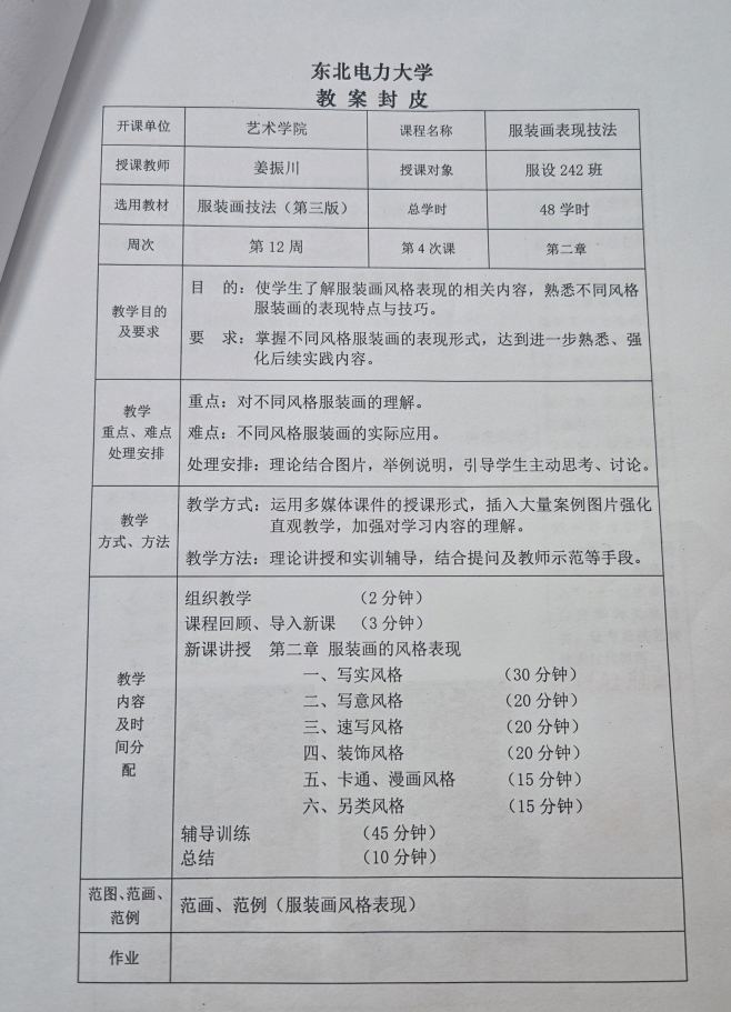 姜振川老师的《服装画表现技法》教案以AI赋能创新,通过智能算法优化思政内容呈现、整合教学素材,匹配生成典型案例参考,有效提升教学内容质量与授课效率。