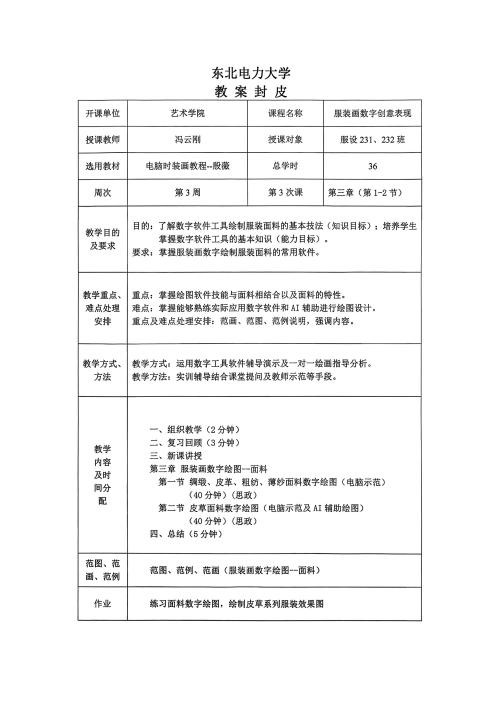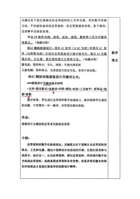 冯云刚老师的《服装画数字创意表现》教案借AI实现多维度提升,丰富课前、课中、课后活动,提炼拓展思政要点,优化教案语序、深化知识,并融入AI绘画设计辅助教学。