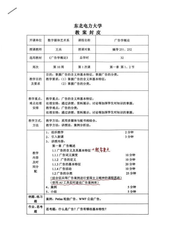 王兵老师的《广告学概论》教案升级为“理论-工具-实践-评价”四位一体系统,通过 AI 分析文献设定分层目标、搭建实时案例库,结合学生学习数据驱动互动教学,设计 AI 辅助评估环节,助力塑造专业传播人才。