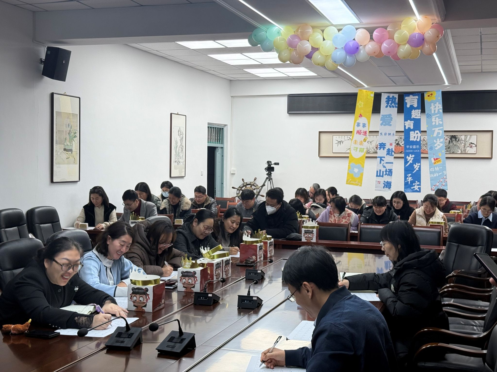 为提升学院教师的归属感和幸福感,营造和谐温馨的大家庭氛围,12月3日下午,艺术学院2025年第三期教工集体生日会在三教A333会议室欢乐举行。学院领导与全体教职工齐聚一堂,共同为8月至12月期间过生日的老师们送上真挚的祝福。