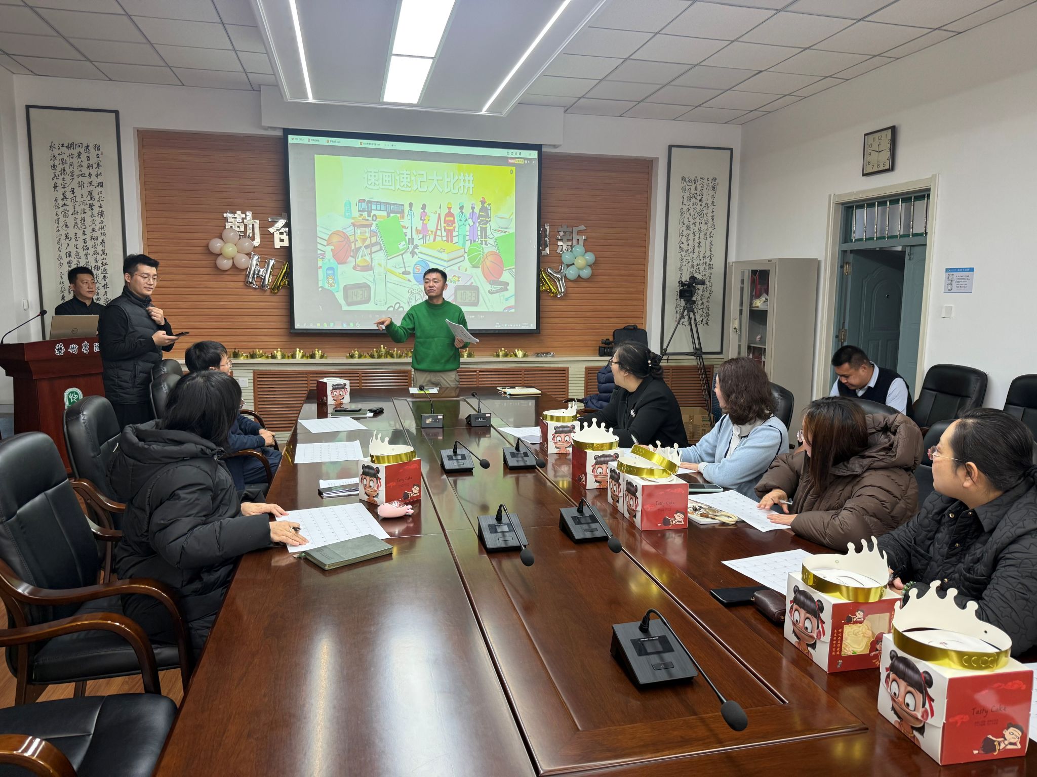 为了让生日会更加妙趣横生,本次活动特别策划了名为《速画速记大比拼》的互动游戏。全体教师积极参与,在游戏中展现了艺术学院教师特有的敏锐观察力、快速记忆力和精湛的绘画功底。游戏过程紧张刺激又笑点频出,引得现场掌声、欢呼声不断,将会场的气氛推向了高潮。